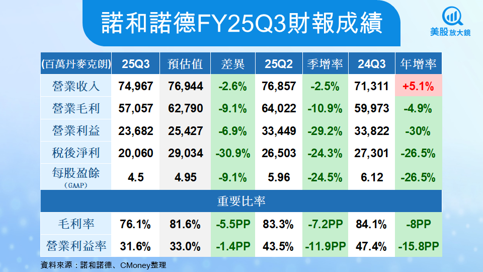 諾和諾德(NVO)2025 年第三季營收為 749.8 億丹麥克朗,年增 5.1%、季減 2.5%,主要受 GLP-1 藥物 Ozempic 與 Wegovy 銷售支撐。然公司組織重整與資產減損影響營業利益大減 21%,營益率僅 31.6%,較前季與去年同期分別下滑 11.9 及 15.8 個百分點。若排除 90 億丹麥克朗的一次性重組費用,營業利益實質仍成長約 7%。