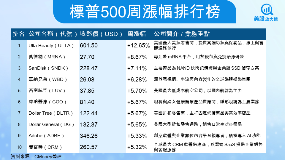 標普 500 指數上週累計上漲 0.3%,收在 6870.39 點,市場在重要通膨與就業數據公布前維持震盪整理。投資人對聯準會政策路徑的預期並未出現明顯轉向,使資金流向更聚焦於個別產業的基本面表現,本週漲幅榜中多數個股來自消費服務、醫療研發與內容娛樂族群。