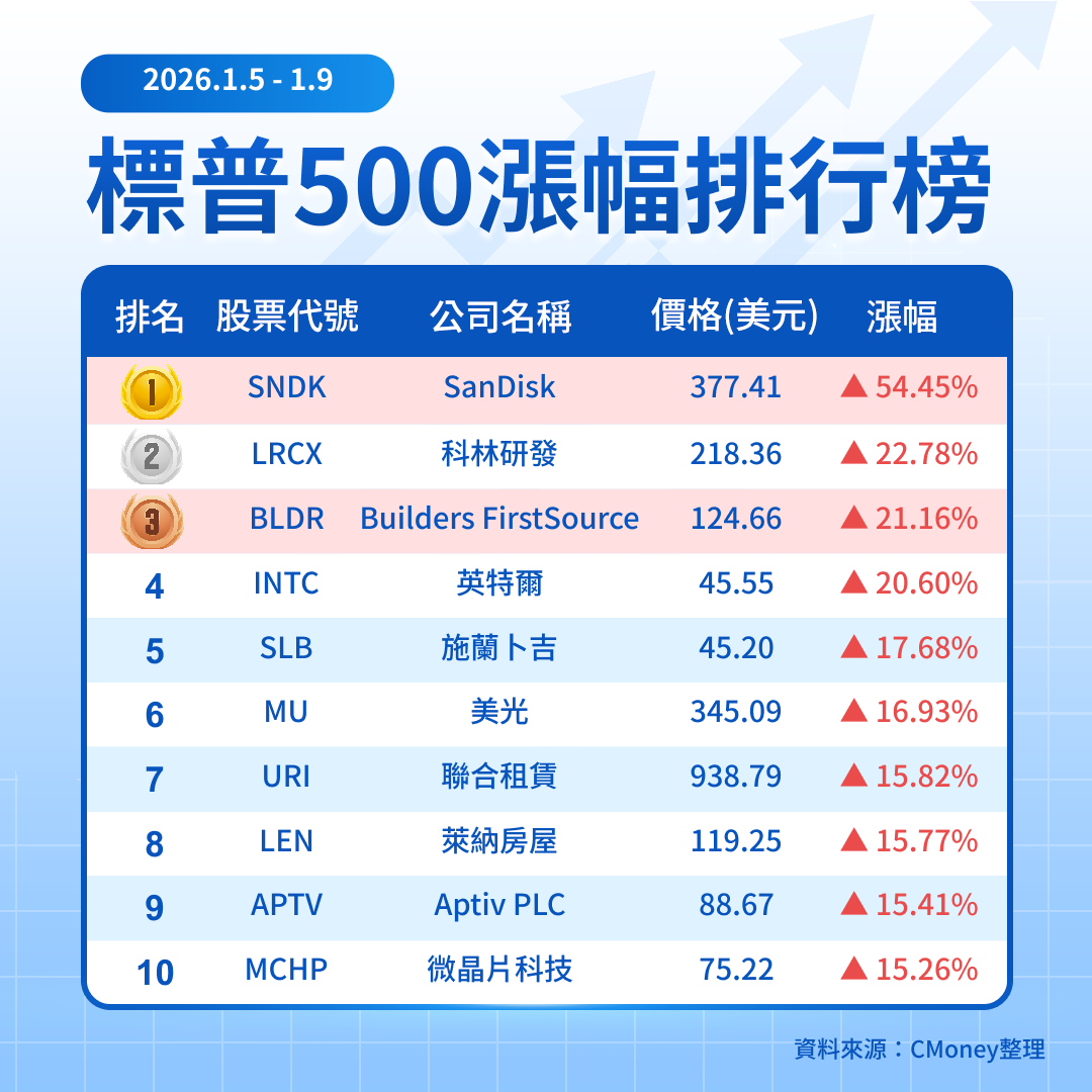 過去一週標普 500 成分股漲幅排行 Top 10(1/5-1/9)