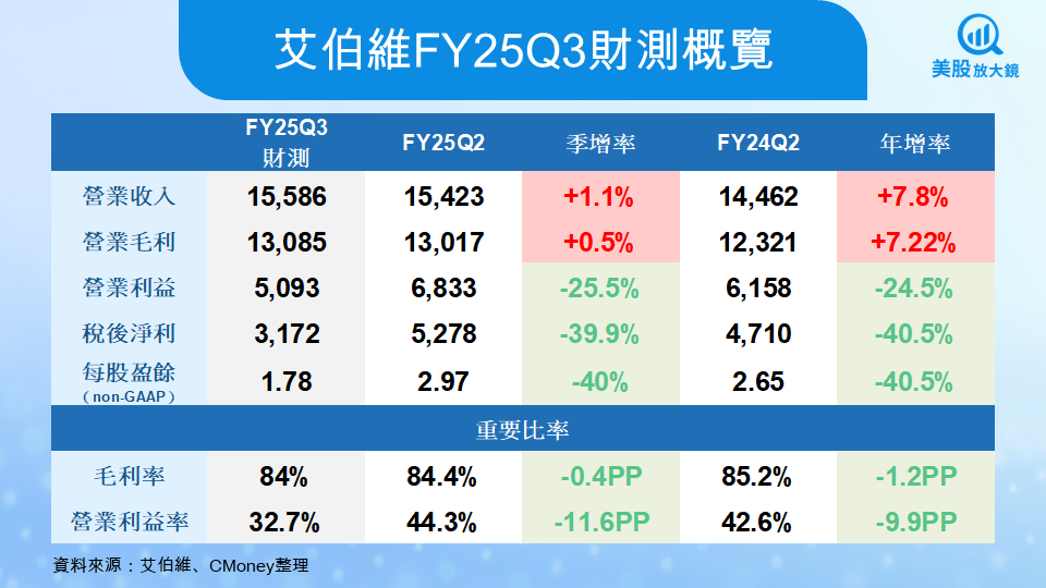 艾伯維財政季度劃分方式:FY25Q3 為 2025 年 7 至 9 月、FY25Q4 為 2025 年 10 至 12 月,依此類推。