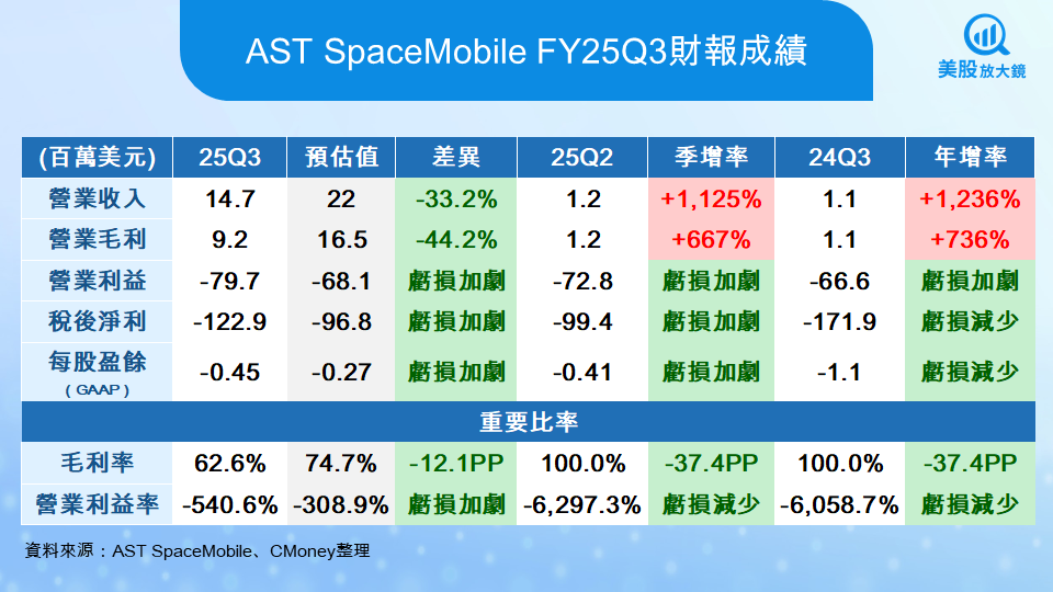 AST SpaceMobile(ASTS)於第三季繳出顯著成長成績,單季營收達 1,470 萬美元,季增超過十倍,主要受惠於美國政府合約階段性完成認列與 Gateway 設備出貨。其中,Gateway 為公司與電信商合作部署的地面通訊站,負責連接衛星與行動網路核心系統,是實現太空與地面網路串接的關鍵設備,同時亦為公司主要營收來源之一。