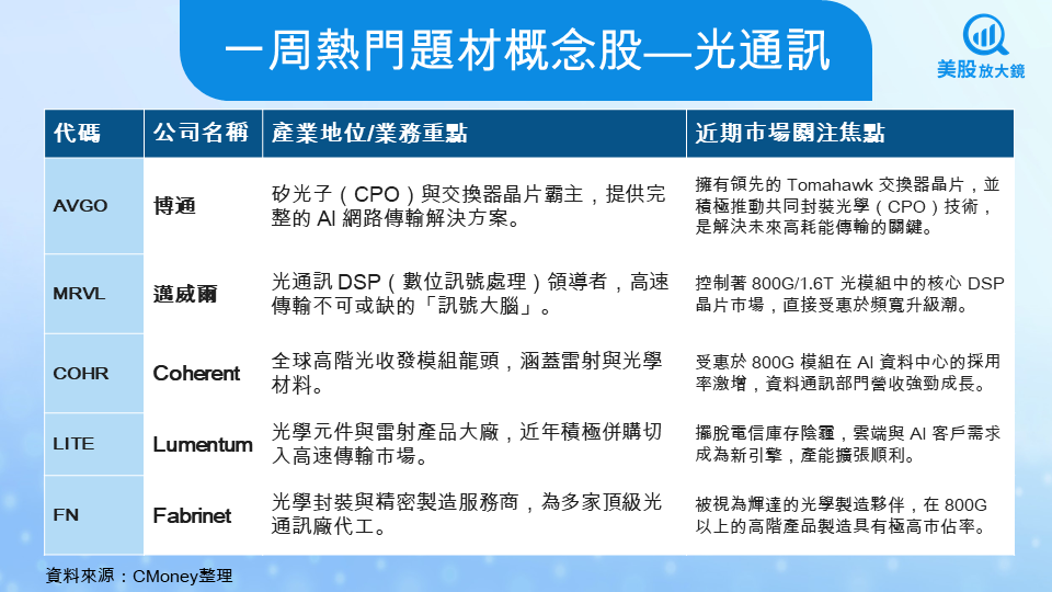 觀察近期美股走勢,資金流向已從「純算力晶片」轉向「傳輸與連結」。博通(AVGO)、邁威爾(MRVL)、Coherent(COHR)、Lumentum(LITE) 與 Fabrinet(FN) 的強勢,反映了市場的一個共識,沒有高速的矽光子傳輸,再強的 AI 晶片也發揮不了效能。