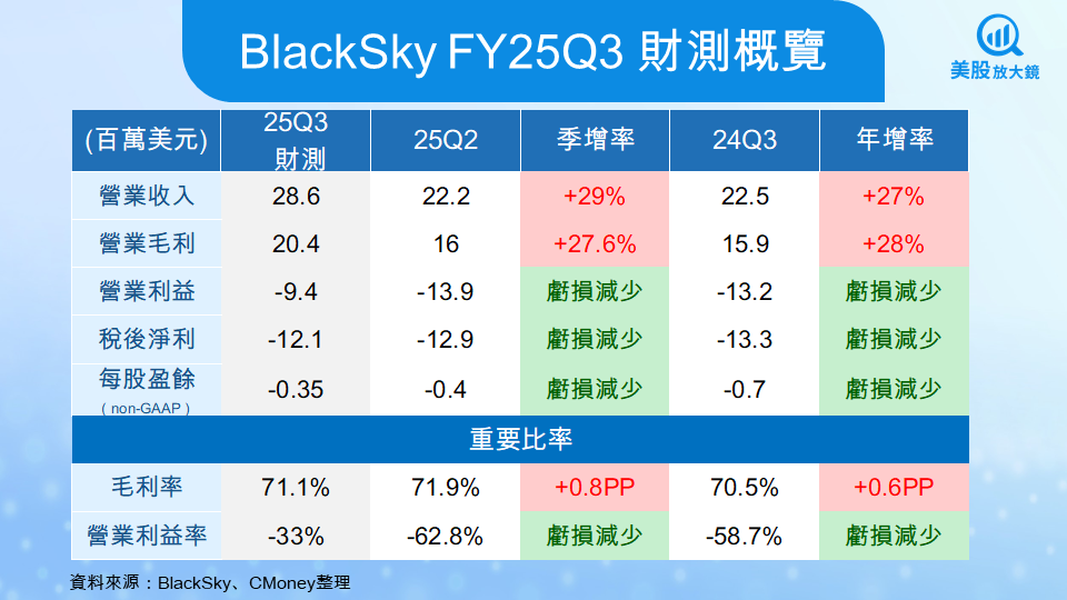 BlackSky 預計於 2025 年第三季交出明顯回升的財報成績,營收可望達 2,860 萬美元,季增 29%、年增 27%,毛利上升至 2,040 萬美元,毛利率提升至 71.1%,顯示 Gen-3 衛星逐步商轉後,AI 驅動的影像與分析服務開始放量。營業虧損預計收斂至 940 萬美元,稅後淨損亦縮小至 1,210 萬美元,每股虧損(non-GAAP)為 0.35 美元,虧損幅度大幅縮減。公司表示,隨 Gen-3 衛星數量於年底前增至 6 顆、2026 年初達 8 顆,衛星覆蓋頻率與任務執行速度將顯著提升,為營收帶來持續貢獻。