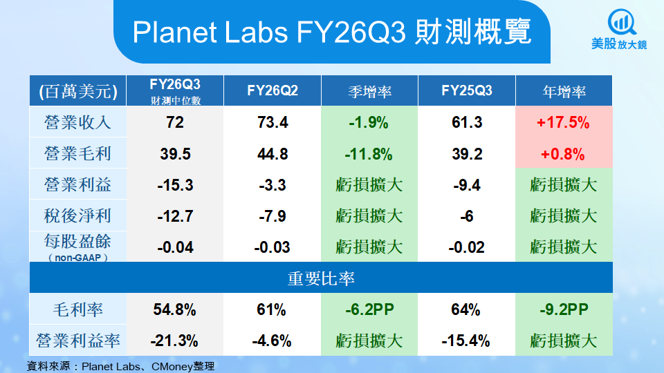 Planet Labs 財政季度劃分方式:FY26Q2 為 2025 年 5 至 7 月、FY26Q3 為 2025 年 8 至 10 月,依此類推。