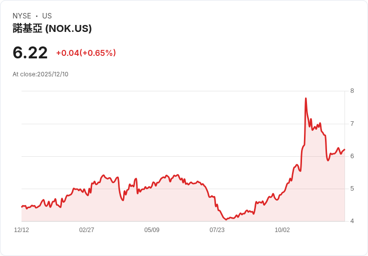 近期,Nvidia宣佈將對諾基亞(NYSE: NOK)投資10億美元,這一訊息曾使該股票飆升至多年的新高點。儘管目前股價回落至每股6.18美元,但專家認為,隨著AI技術的發展,諾基亞的股價可能會在未來一年內出現大幅上漲。