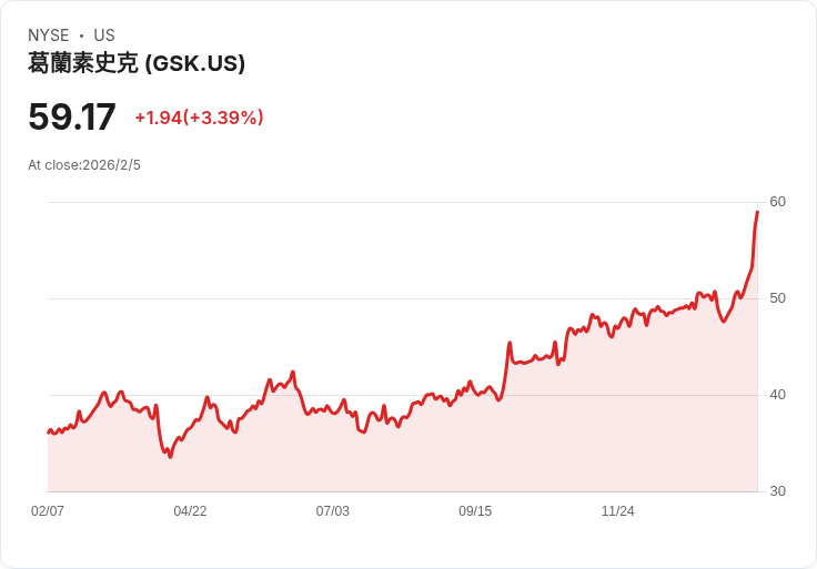 英國製藥巨頭GSK股價在過去七個交易日內持續上揚,最新報價達60.29美元,年初至今累計漲幅22%。