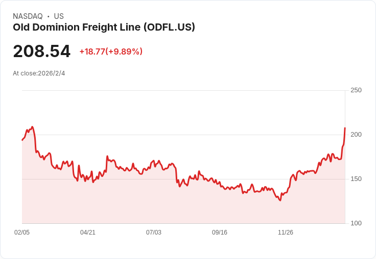 在市場的關注下,Old Dominion Freight Line Inc.(NASDAQ:ODFL)近日股價驚人上漲9.89%,收於每股208.54美元。這一漲幅源自摩根士丹利將其目標價從190美元上調至209美元,並維持“增持”評級。然而,公司在2025年的全年度及第四季度卻面臨了令人失望的財報結果。在整體收入減少和淨利潤下降的背景下,Old Dominion仍宣佈提高季度股息至每股0.29美元,顯示出一定的信心。雖然有分析師看好ODFL的投資潛力,但也有意見認為某些AI股票可能更具吸引力和回報潛力,值得投資者考量。未來,投資者應密切關注該公司的發展動態以及行業趨勢,以作出明智決策。