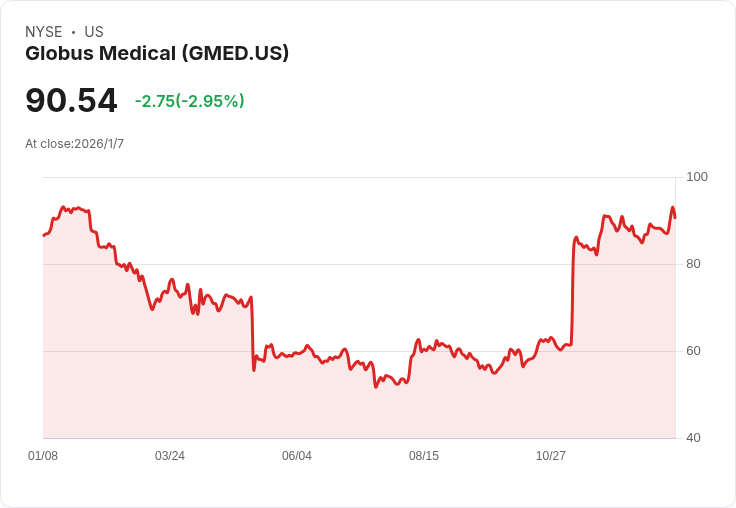 全球醫療器械公司 Globus Medical (GMED) 最近公佈了其 2025 年第四季度的初步業績預測,顯示出強勁的成長潛力。根據公司的預估,該季度銷售額約為 8.23 億美元,相較於 2024 年同季增長 25.2%。此外,Globus Medical 還設定了 2026 年的全年收入指導範圍,預計在 31.8 至 32.2 億美元之間,並且每股稀釋非 GAAP 盈餘預測在 4.30 至 4.40 美元之間。