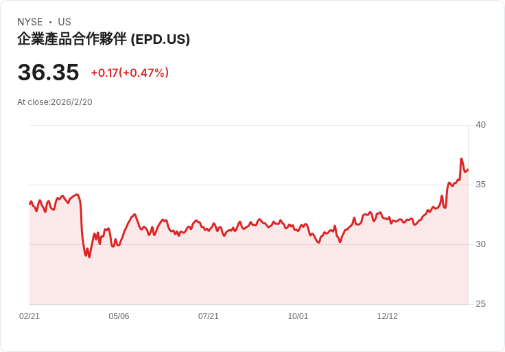 企業產品合作夥伴(EPD)以穩定的6%收益率和27年連續增配吸引投資者,展現出強勁的成長潛力。