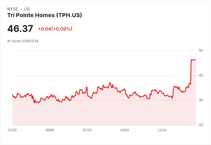 Tri Pointe Homes第四季非GAAP每股盈餘為0.80美元,超出預期;但營收下滑22.4%,顯示市場仍然疲弱。