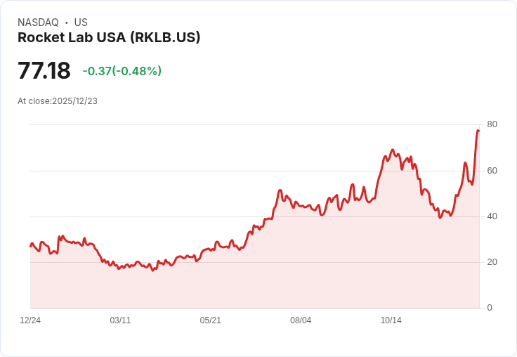 火箭實驗室(Rocket Lab Corporation, RKLB)於2025年12月23日創下歷史新高,當天收盤報77.55美元,此前公司成功完成第21次電子火箭的發射。自年初以來,該股漲幅已超過300%,而同期標普500指數僅上漲17%。這波驚人漲勢讓投資者想起Palantir(PLTR)的表現,兩者都面臨著是否被高估的討論。