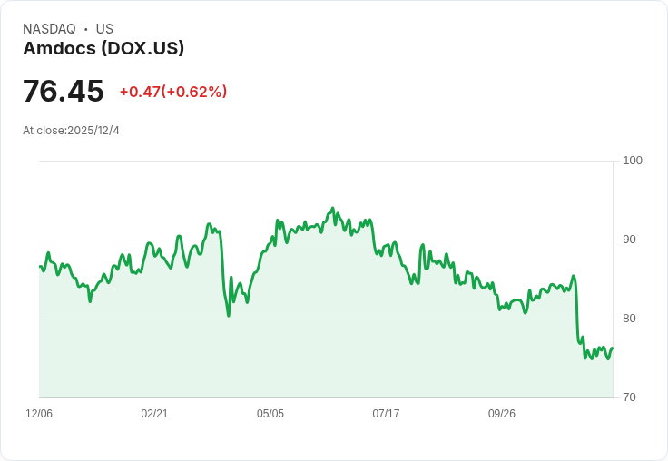 Amdocs Limited(DOX)近期受到市場關注,其股價在12月1日交易時報75.55美元。該公司是一家中型科技服務企業,專注於通訊、媒體和娛樂行業,提供包括AI、雲端技術及5G解決方案等多元化服務。儘管近期營收下降6.8%,但Amdocs仍保持37.2%的毛利率,顯示出其財務健康狀況。