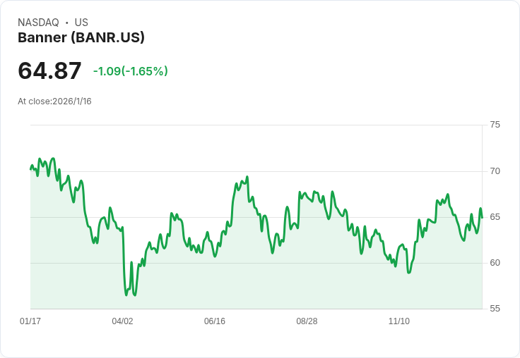近期Banner(BANR)的股價表現混合,昨日下降1.7%,過去30天也下跌了3.16%。目前股價為64.87美元,而其三年總股東回報率為12.09%,五年則高達47.87%。這樣的資料顯示,最近的股價動能似乎冷卻,相較於長期增長而言。