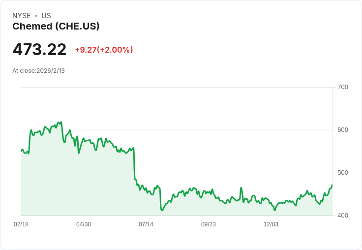 在2026年2月12日,Barington Companies Management 宣佈以約556萬美元的交易額,增持了Chemed(NYSE:CHE)的13,000股股份。這筆投資使其在報告的美國股票資產中佔比達到3.65%。根據SEC的檔案,Chemed目前股價為463.95美元,相較於去年下降了15.18%,並落後於標準普爾500指數28.09個百分點。