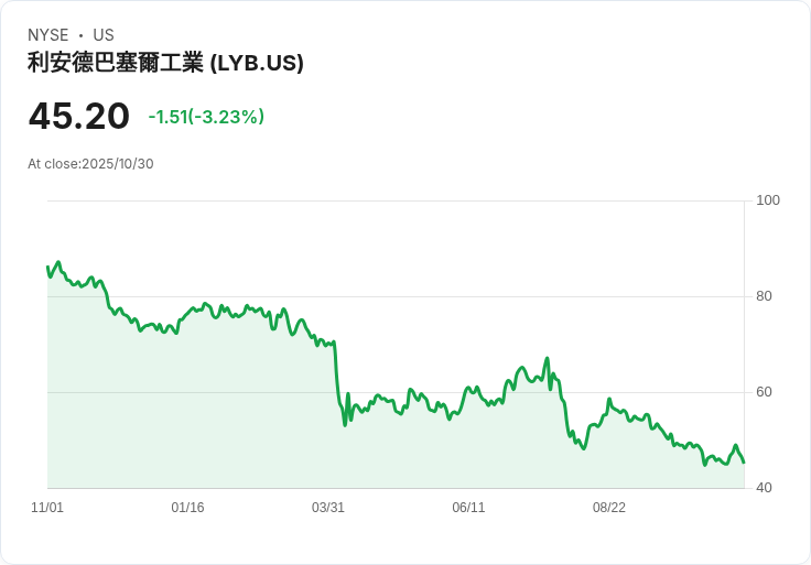 LyondellBasell Industries N.V.是一家全球領先的化工公司,專注於生產聚合物、化學品和燃料。公司擁有廣泛的產品組合,包括聚乙烯、聚丙烯、氧化物和衍生物等,這些產品被廣泛應用於包裝、建築、汽車和電子等行業。LyondellBasell以其創新能力和可持續發展承諾而聞名,致力於透過技術進步和資源優化來提升其市場競爭力。