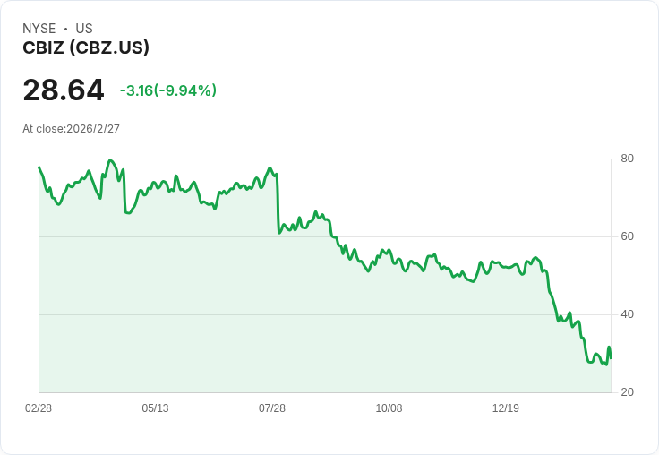 CBIZ(NYSE:CBZ)因有機成長疲弱及未來財務指引保守,今日股價下滑9.7%。投資者對其2026年的收入增長預測持謹慎態度。