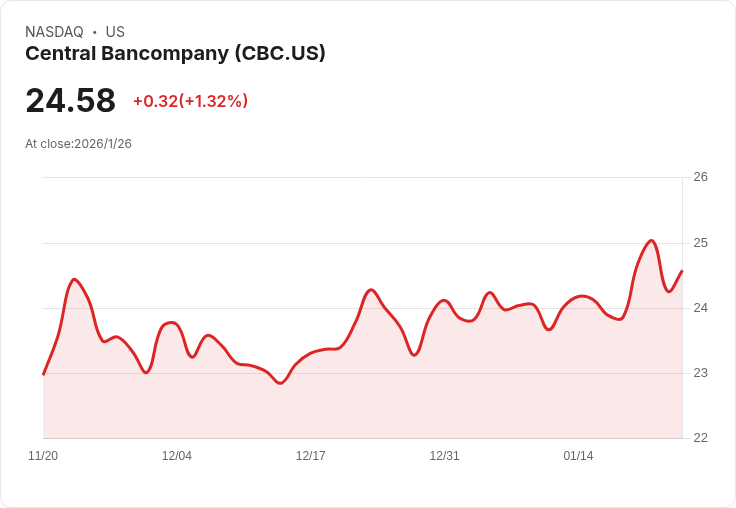 中央銀行公司公佈最新財報,顯示第四季每股盈餘為0.47美元,營收增至2.72億美元,貸款總額持平於114億美元。