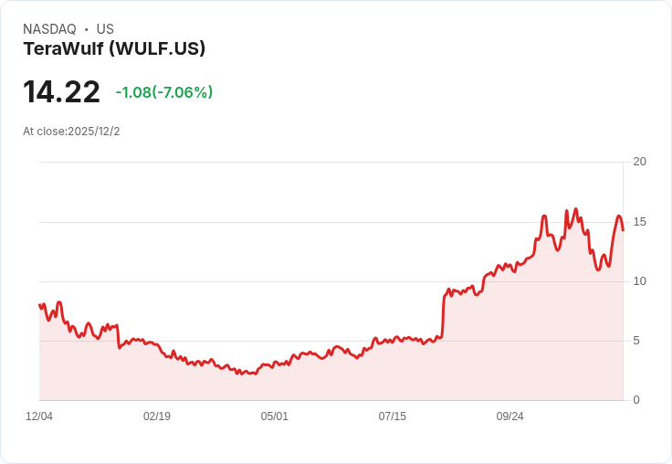 TeraWulf因即將進行的優先股轉普通股,導致投資者拋售,股價下跌7.06%,收於14.22美元。