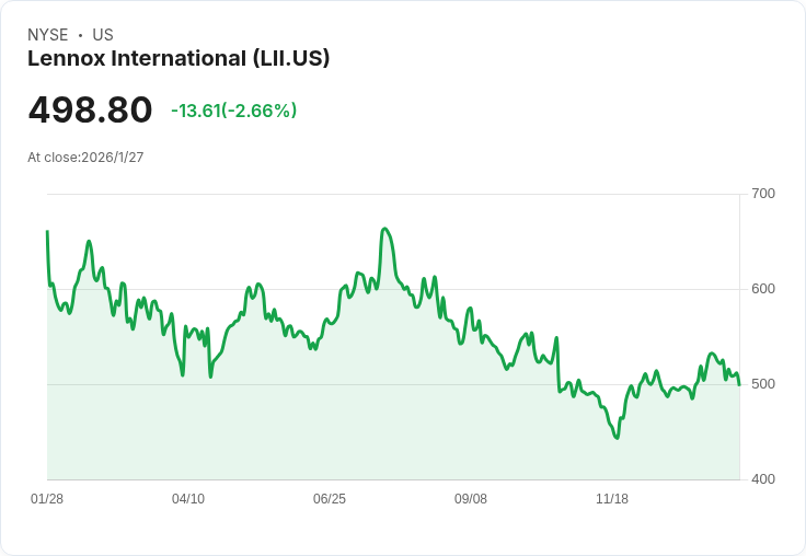 Lennox International(LII)在週三的盤前交易中股價下滑4.6%,原因是該公司公佈的第四季財報顯示,其盈餘與收入均低於華爾街預期。調整後每股收益為4.45美元,同比下降22%,遠低於市場共識的4.72美元;而收入則從去年同期的12億美元下降11%至10.2億美元,也未能達到分析師預測的12.6億美元。