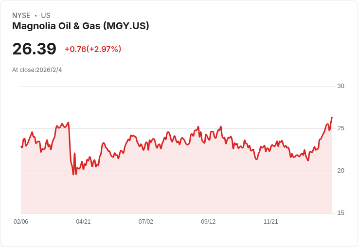梅花石油(Magnolia Oil & Gas, NYSE: MGY)定於2月6日星期五,在市場開盤前公佈其第四季度的財報。根據市場共識,每股盈餘(EPS)預計為0.36美元,較去年同期下降10%,而營收則預估達到3.1374億美元,同比減少3.4%。
