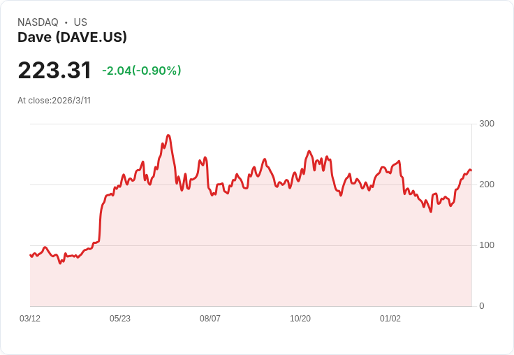 在2026年2月17日,Findell Capital Management公開增持了32,000股Dave(NASDAQ:DAVE),交易估值達到688萬美元。根據證券交易委員會的申報檔案,這一增持使得Findell在Dave的持倉增加至約1590萬美元,佔該基金可報告資產管理規模的4.9%。與此同時,Dave的股價已經從去年同期的$145.55上漲至目前的$218.56,增幅高達150%,遠超標普500指數21%的漲幅。