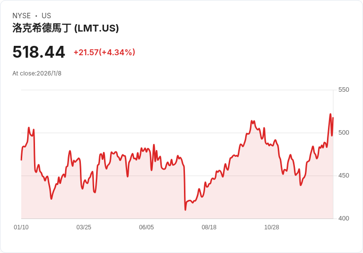 在最新的市場交易中,洛克希德馬丁(LMT)股價上漲4.2%,創下52週新高543.08美元。這一上漲主要得益於Truist Securities將其評級從持有上調至買入,並將價格目標從500美元提高至605美元。分析師Michael Ciarmoli指出,儘管洛克希德在2025年的表現不佳,但其吸引人的估值使其在2026年展現出良好的風險/回報潛力。他預期,在地緣政治緊張局勢推動需求的背景下,洛克希德的導彈產品線將受益匪淺,包括與美國政府簽訂的七年協議,以提高PAC-MSE產能,以及美國陸軍的一項42.4億美元合同,用於增加GMLRS生產量。