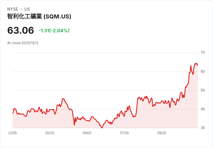 在週四的交易中,智利鋰業公司Sociedad Quimica y Minera de Chile (SQM)股價下跌4.5%,原因是高盛將其評級從「買入」下調至「中性」,並設定63美元的目標價。高盛分析師Marcio Farid表示,之前對SQM的看好主要基於對鋰價回升及自由現金流表現改善的預期,但該股自年初以來已上漲80%,自2025年6月起更是飆升115%,顯示出股價過度反應基本面。