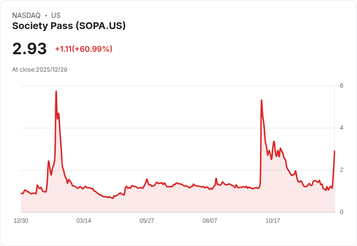 社會透過公司(Society Pass Incorporated, SOPA)近日公佈將進行一項公共股票發行,計畫出售150萬股,定價為每股2美元。這筆交易預計在扣除費用和開支前可產生300萬美元的總收益,並且該發行預定於2025年12月31日完成。