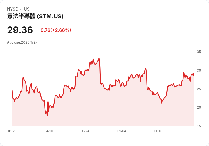 STMicroelectronics 預計於1月29日公佈第四季財報,市場普遍預期每股盈餘為0.28美元,營收達32.9億美元。