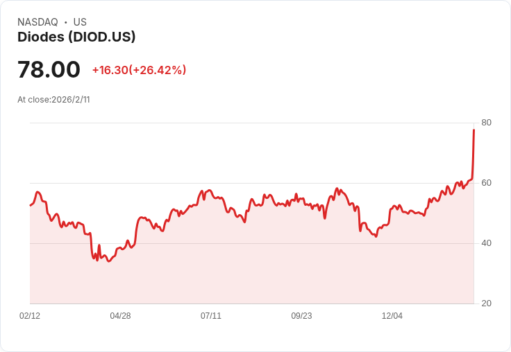 Diodes (DIOD) 在週三市場交易中,其股價因2025年第四季財報表現優異而飆升超過25%。該公司預計2026年第一季收入將介於3.83億至4.06億美元,遠超市場共識376萬美元。首席執行官Gary Yu表示:“我們在2025年結束時,第四季收入同比增長15%,全年增長13%,是自2021年以來最高。”此外,Diodes在整個2025年計算機市場也實現了25%的增長,主要受人工智慧伺服器應用推動。