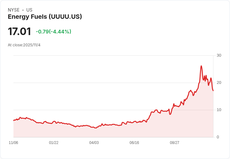 在週三的交易中,能源燃料(UUUU)股價下跌4.8%,因Roth Capital將其評級從中立降為賣出,目標價格定為11.50美元。分析師Joe Reagor指出,隨著對該公司稀土業務潛力的興奮逐漸消退,預計2025年底或2026年初之前的經濟研究將使公司的估值重回基本面。