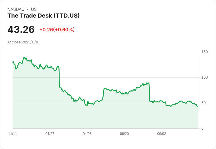 隨著美國股市在2025年第三季度的強勁反彈,Baron Funds發佈了其“Baron Technology Fund”投資者信函,指出The Trade Desk, Inc.(NASDAQ:TTD)在此期間表現不佳。該公司專注於自助式雲端廣告購買平臺,但最近一個月內股價下跌14.73%,過去52週更是損失67.03%。截至11月10日,TTD的股價為每股43.26美元,市值達到209.2億美元。