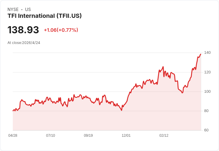 TFI International(代號:TFII)公佈2026財年第一季財報,呈現比市場預期更佳的營運表現:非GAAP每股稀釋盈餘(EPS)為0.69美元,超出分析師預期約0.08美元;營收為19.5億美元,年減0.5%,但仍高出預期約5,000萬美元。公司同時發布第二季指引,在假設營運環境無重大正負變化下,預期調整後稀釋EPS落在1.50至1.60美元,遠高於市場共識的1.29美元。