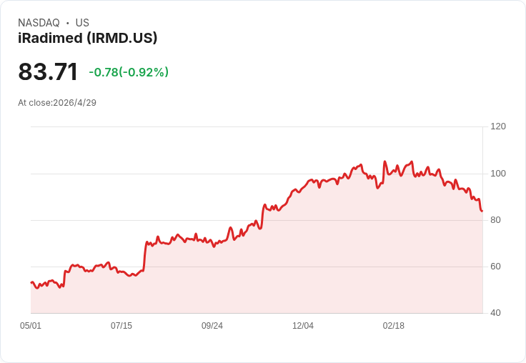 新聞 : iRadimed(NASDAQ: IRMD)預計於美東時間5月1日、股市開盤前公佈2026財年第一季財報。市場共識預估本季每股盈餘(EPS)為0.45美元、年增約7.1%;營收預估為2,132萬美元、年增約9.3%。投資人與分析師將密切關注公司是否延續過去穩定超越預期的表現,以及管理層對全年展望的更新。