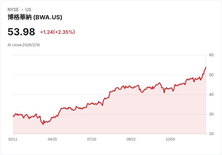 博格華納公佈第四季財報,非GAAP每股盈餘為1.35美元,超出預期;同時提供2026年營收及獲利指引。