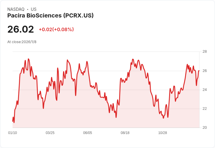 Pacira BioSciences因調整2025年營收預期,股價在盤後交易中暴跌約10%。公司初步報告全年營收726.4萬美元,低於市場共識730.22萬美元。