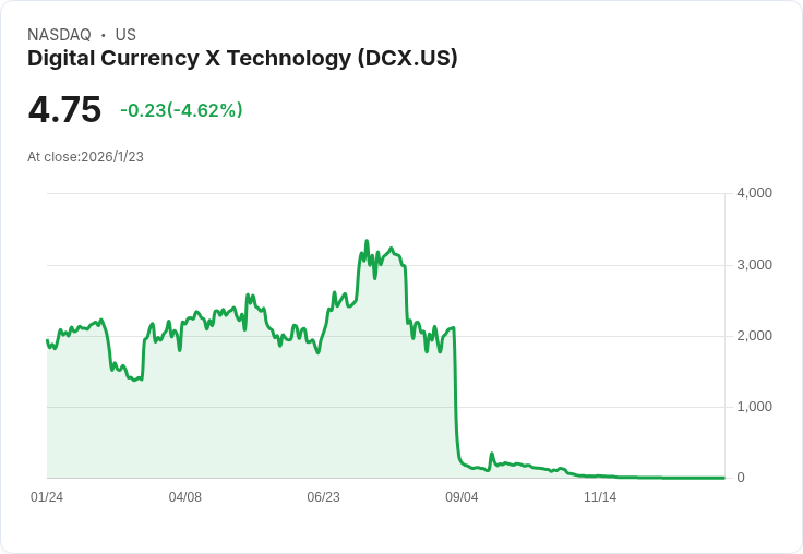 如果數位貨幣X未能在2026年1月27日前提出上訴,將於2026年1月29日開盤時停止交易。儘管該公司已經完成了12比1的股份合併,但仍表示無法保證會重新獲得或維持納斯達克的合規標準。目前,DCX的股價下跌3.91%,收於4.785美元。該公司正計劃請求聽證會,以對抗這項決定,未來發展值得關注。