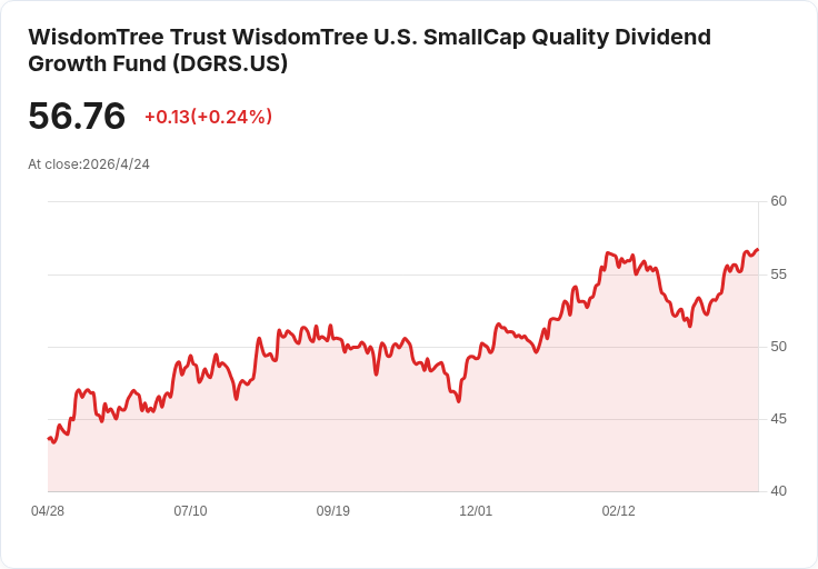 WisdomTree 旗下的 WisdomTree U.S. SmallCap Quality Dividend Growth Fund(代號 DGRS)宣佈本月每股現金配息 0.0900 美元,並於 4 月 29 日付款。該基金 30 日 SEC 殖利率為 2.00%,資料截至 4 月 24 日;除息日與股權登記日均為 4 月 27 日。