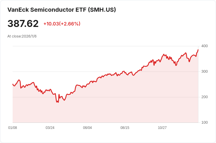 1. VanEck半導體ETF (SMH),資產管理總額$392.8億 2. iShares半導體ETF (SOXX),資產管理總額$182.1億 3. Direxion每日半導體牛市3倍份額 (SOXL),資產管理總額$137.8億 4. ProShares超級半導體 (USD),資產管理總額$17.6億 5. SPDR S&P半導體ETF (XSD),資產管理總額$16.5億 6. First Trust納斯達克半導體ETF (FTXL),資產管理總額$13.9億 7. Invesco半導體ETF (PSI),資產管理總額$10.5億 8. Direxion每日半導體熊市3倍份額 (SOXS),資產管理總額$10.4億 9. Invesco PHLX半導體ETF (SOXQ),資產管理總額$8.3852億 10. Strive美國半導體ETF (SHOC),資產管理總額$1.444億