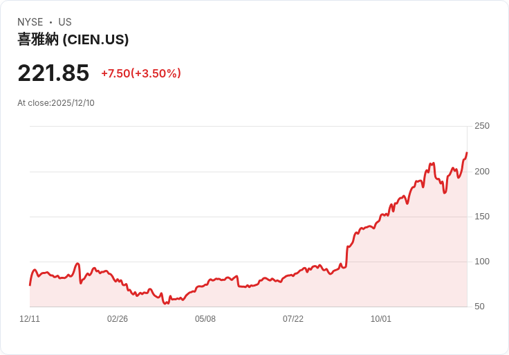 Ciena(CIEN)於週四在盤前交易中股價大幅上漲超過10%,因為該網絡系統供應商公佈了超出市場預期的財報及未來指引。根據截至11月1日的季度報告,Ciena調整後每股收益為0.91美元,年收入較去年增長20.5%,達到13.5億美元。而三位主要客戶貢獻了43.6%的季度總收入,顯示出公司對特定客戶依賴度。