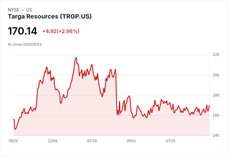 Targa Resources Corp. (NYSE: TRGP) 最近受到了華爾街分析師的高度關注。BMO Capital 的分析師 Ameet Thakkar 在9月18日將其股票評級提升至「買進」,並預測價格目標為185美元。他指出,儘管面臨困難的Permian油田環境,Targa 仍然有能力超越行業平均水平,其增長潛力顯著。此外,Thakkar 還提到,目前 Targa 的交易估值較 S&P 500 和同業 C-Corp 股份有明顯折扣,使其成為投資者的吸引選擇。