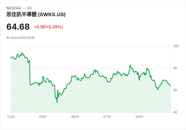 在經歷了六個交易日的持續下跌後,Skyworks Solutions (NASDAQ:SWKS) 的股價終於迎來反彈。週五,其股價收盤上漲0.31%,達到64.69美元。然而,在此之前,公司股價已累計下滑超過6.28%,而標準普爾500指數則僅下跌1.63%。更值得注意的是,2025年以來,Skyworks的股價已下降26.33%,相較之下,標準普爾500指數卻實現了15.19%的增長。