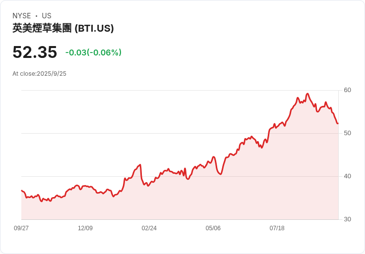 英美煙草(British American Tobacco, NYSE:BTI)在連續六天下跌後,於上週五終於迎來反彈,股價上漲1.24%至53美元。自9月18日以來,該股曾一度下跌至54.92美元,累計損失近5%。然而,從年初至今的表現來看,英美煙草的股價已上漲超過45%,而過去一年更是增長了39.5%。