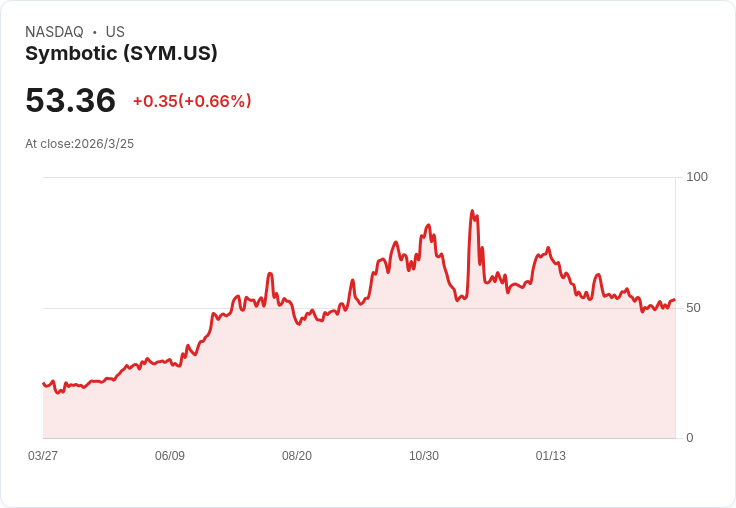 Symbotic Inc.(NASDAQ:SYM)被視為當前最佳的純粹機器人股票之一,專注於大型倉庫自動化。該公司利用人工智慧驅動的機器人和軟體平臺,以提升倉儲及配送中心的效率。然而,儘管在2025年股價上漲超過150%,但截至目前,今年已經下跌約12%。分析師對這支股票的評價不一,40%以上的分析師給予買入評級,而未來一年中位數目標價為70美元,顯示出33%的潛在上升空間。