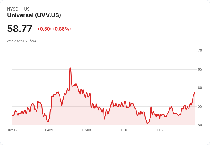 環球公司(Universal Corporation, NYSE: UVV)近日宣佈將於2026年5月4日支付每股0.82美元的季度股息,此訊息令許多投資者感到振奮。根據公告,股息適用於在4月15日之前登記的股東,而該股票的除息日亦為同一天。這一舉措顯示出環球公司對其股東的承諾及穩定的財務表現。