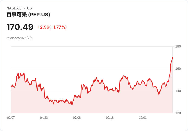 在近期的股市中,百事可樂(PepsiCo)股價於週五上漲1.84%,收盤報170.62美元,這是該公司股價連續第七天上漲。自1月29日至2月5日間,其股價已累積增長約12.67%,而同期標普500指數則下滑2.45%。此次股價上揚主要受到公司第四季度盈餘和營收表現超出市場預期,以及2026年的前景展望所驅動。