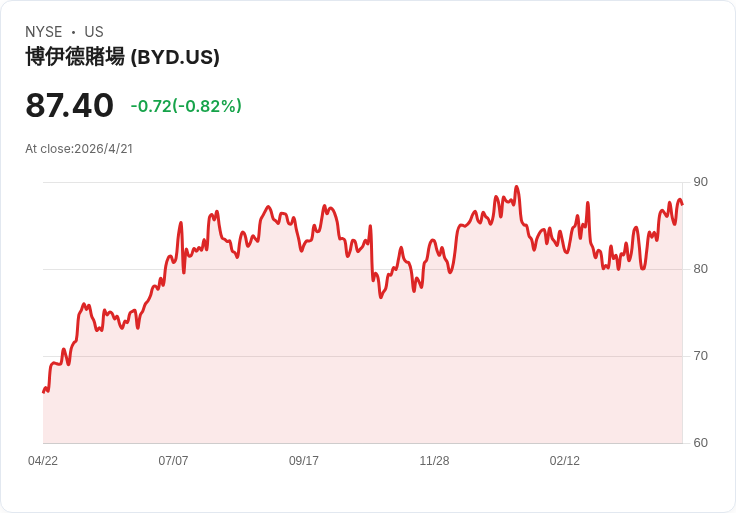背景與現況: - 上季表現:公司報告營收約10.6億美元(年增2%),為營收面的小幅勝出,但經營利潤未達市場預期。 - 本季市場預期:分析師普遍預估本季營收年增趨於持平,較去年同季的3.2%成長放緩。過去30天內,多數追蹤分析師維持既有估值,顯示市場短線對公司業績變動的預期較穩定。 - 同業與產業情勢:消費性非必需品類股近期多頭走勢,平均近一月上漲11.3%;部分同業已公佈的第1季數據顯示強勁,例如Monarch營收年增8.9%、超預期5.2個百分點;Levi's營收年增14.1%、超預期5.6個百分點,Levi's 公佈後股價曾上漲10.7%。博伊德近一月股價上漲約7%,分析師平均目標價為94.73美元,目前股價約87.70美元,留有上行空間但也反映部分期待。