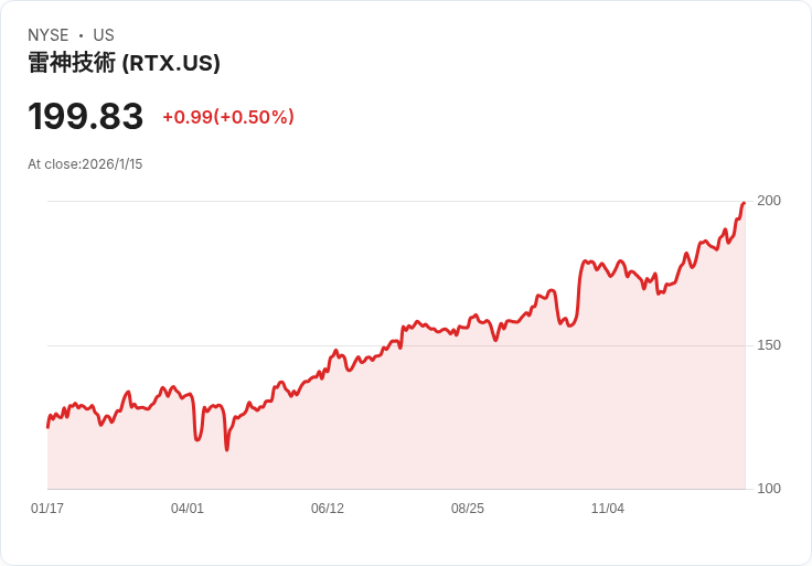 近期,RTX Corporation(RTX)的股價表現引人注目,在週五的交易中上漲了0.96%,達到每股201.75美元,這是其連續第七個交易日錄得增幅。自1月8日至15日,該股累計上漲6.76%,顯著超過同期標普500指數僅上漲0.33%。