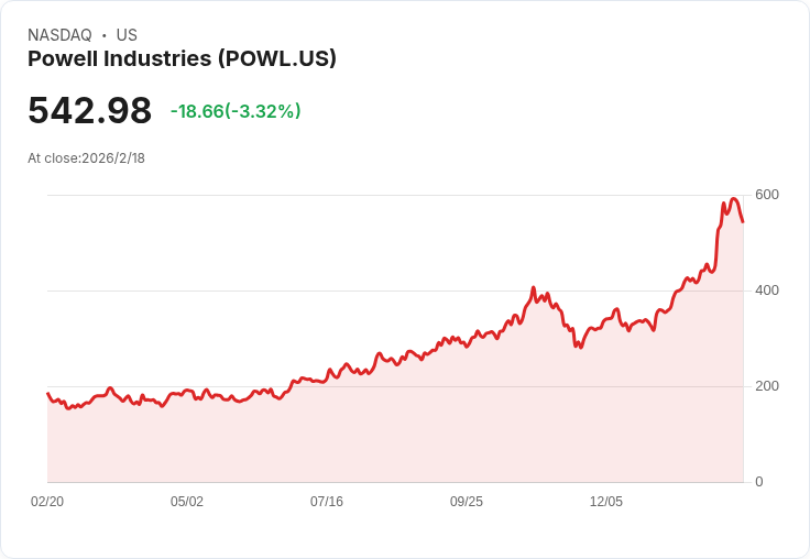 截至2026年2月18日,波威電力的股價為542.98美元,較去年同期上漲了161.6%,表現遠超標普500指數149.29個百分點。該公司的市值達到65.9億美元,過去12個月的收入為11.1億美元,淨利潤為1.8737億美元。