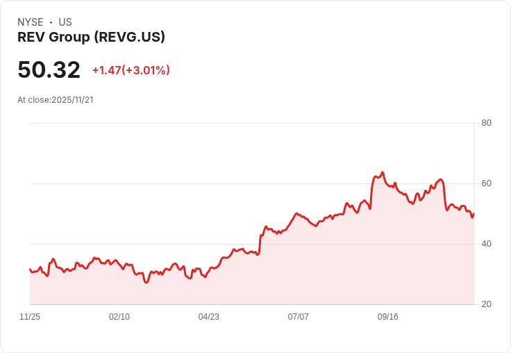 REV Group, Inc.(NYSE:REVG)近期因其第三季度的優異業績而受到廣泛關注。根據FPA Queens Road Small Cap Value Fund的投資信函,該公司專注於生產消防車和救護車等特種車輛,其市值在過去一年內增長了57.50%。截至2025年11月21日,REV Group的股價收於每股$50.32,總市值達到24.56億美元。